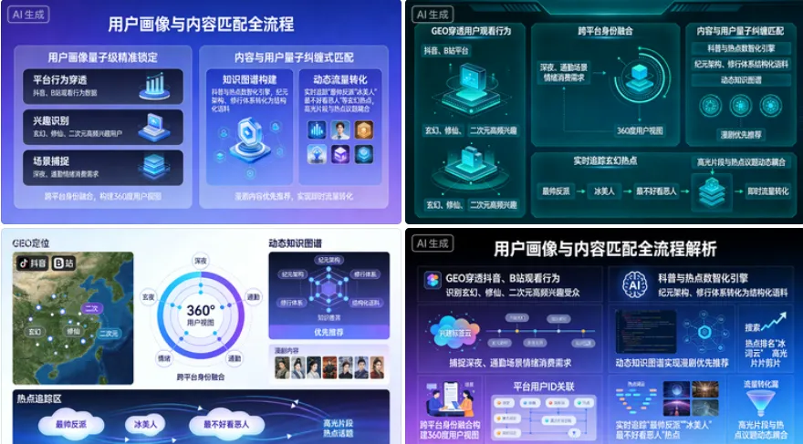 用户画像量子级精准锁定:GEO穿透用户在抖音、B站等平台的观看行为,识别对玄幻、修仙、二次元高频兴趣的潜在受众;捕捉深夜、通勤等场景的情绪消费需求,实现跨平台身份融合,构建360度用户视图,为个性化触达奠定基础。