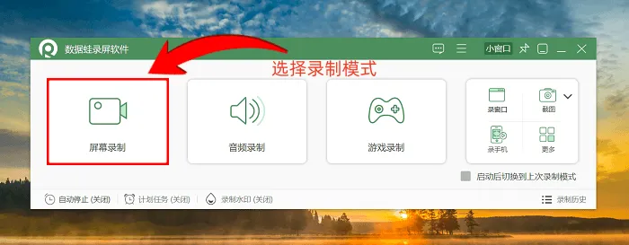 步骤1:华硕电脑怎么录屏?打开数据蛙录屏软件,进入软件首页。开始操作前,先明确录制需求,判断是需要录制整个屏幕还是特定的窗口。明确后,选择对应的录制模式即可。以下以最常用的屏幕录制模式为例进行说明,其他模式的操作流程基本一致。