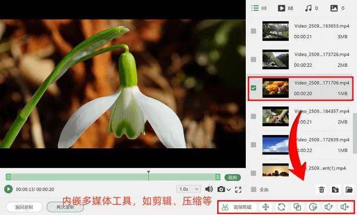 最省心的是,软件内置后期处理工具,录制完成后直接就能进行片段剪辑、添加转场,还能完成格式转换和体积压缩,无需在多个软件之间来回切换折腾。