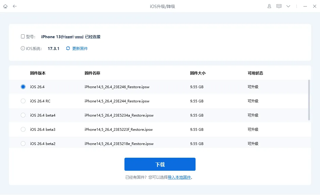 步骤3:选择需要升级的固件版本后,点击【下载】等待开始下载iOS固件