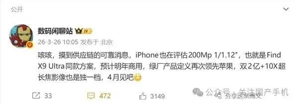 值得关注的是,这一影像方案将在OPPO Find X9 Ultra上先行采用。这意味着在顶级影像产品的定义与节奏上,以OPPO为代表的国产手机厂商已经领先了苹果公司整整一年时间,占据了市场先机。