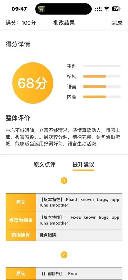 作文批改功能覆盖英语与语文两大学科。英语作文批改支持分年级评分,可识别病句并提供修改建议,同时生成综合评语,辅助学生提升写作能力。语文作文批改则支持拍照识别或粘贴原文两种方式,系统对整篇作文进行评价并提出提升建议,帮助学生把握写作要点。