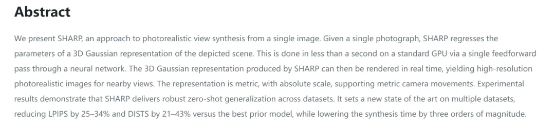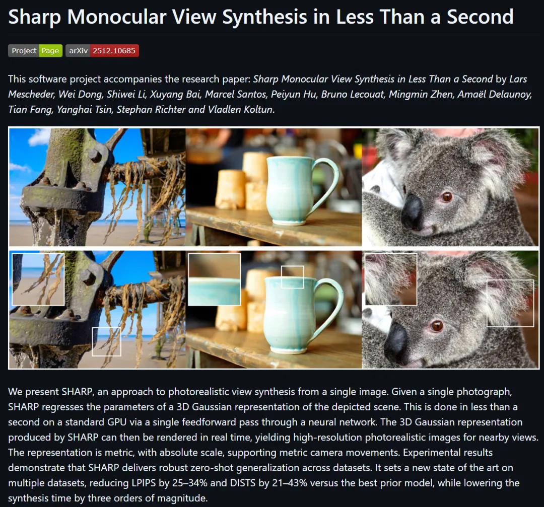 @inproceedings{Sharp2025:arxiv, title = {Sharp Monocular View Synthesis in Less Than a Second}, author = {Lars Mescheder and Wei Dong and Shiwei Li and Xuyang Bai and Marcel Santos and Peiyun Hu and Bruno Lecouat and Mingmin Zhen and Ama\"{e}l Delaunoy and Tian Fang and Yanghai Tsin and Stephan R. Richter and Vladlen Koltun}, journal = {arXiv preprint arXiv:2512.10685}, year = {2025}, url = {https://arxiv.org/abs/2512.10685},}