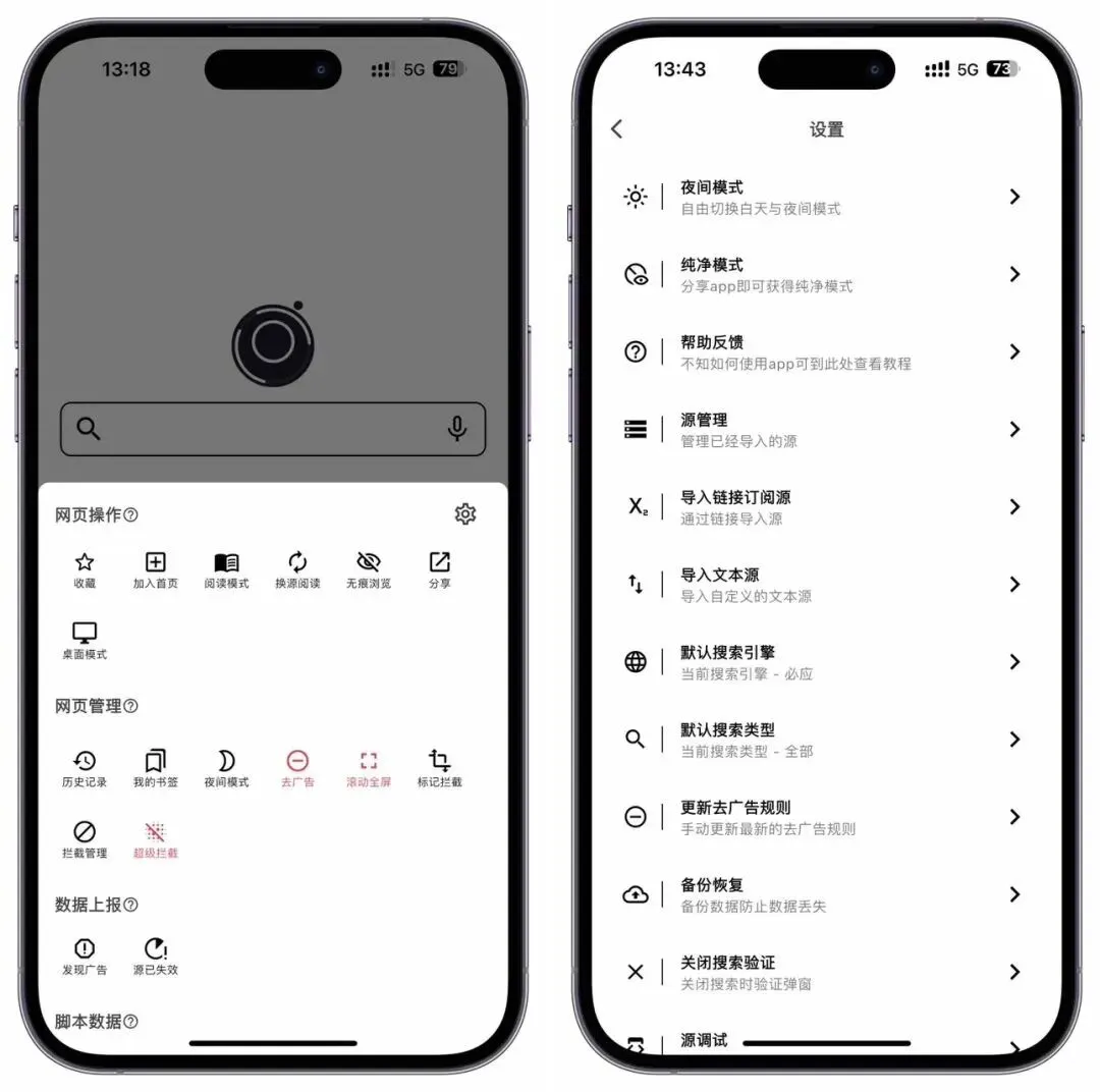 一款非常不错的浏览器软件,这款软件主要功能有浸式阅读,更加专注内容,图集、文本、图文、視頻等,支持添加源,内置去广纯净模式,超级拦截,桌面模式,手动去犷规则更新,查看源码,脚本执行,等等