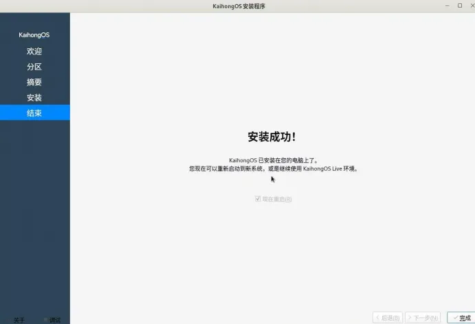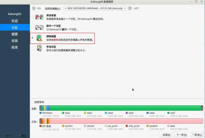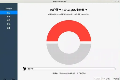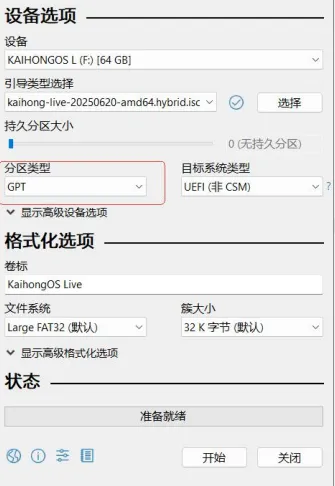 3.设备:选择要制作的U盘,引导类型:选择系统镜像文件:分区类型:选择GPT,然后就可以点击开始制作了,制作完成后拔掉U盘!把制作好的U盘,插入要安装的电脑上,开机设置启动项,让电脑从U盘启动(带uefi的选项)。和平时装Windows类似!如果未能自动拉起 KaihongOS 安装程序,则需要在桌面通过右键唤起终端,输入以下命令手动启动安装程序。