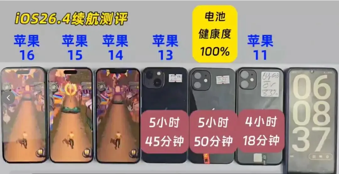 目前大家在用的机型,有iPhone16、iPhone15、iPhone14。好评君发现,这两天,苹果官方已经推送了iOS26.4正式版。这次iOS26.4的功能升级非常猛,有二三十项大大小小的功能升级。从壁纸、液态玻璃效果,到环境音效以及emoji表情都有。有博主找来了6部iPhone手机,来测试iOS26.4正式版的续航。它的电池健康度只剩余88%,坚持了6小时17分钟。对于iOS26.4的续航表现,网友们的态度出奇的一致。有网友表示,iOS26.4的发布,直接斩断了老机型的续航底气。对于这个结论,其他网友表示,可以出门带个共享充电宝,来给手机充电回血。但这个想法依然被专业的网友否定了,因为老机型运行新系统会发热。并且一天充几次电体验很差,而且老机型无法实现满血流畅运行。另外也有网友表示,iOS26.4配合电池健康度高的新机型使用,简直就是体验神器。就算是没有满血电池,用iPhone13代替一样可以达到效果。看得出来,有了iOS26.4之后,只要机型够新不管玩什么都有保障。好评君觉得,iOS26.4发布之后,对想要体验新功能的用户简直就是刚需。尤其是电池健康度高、性能强的机型,升级iOS26.4简直就是神器。