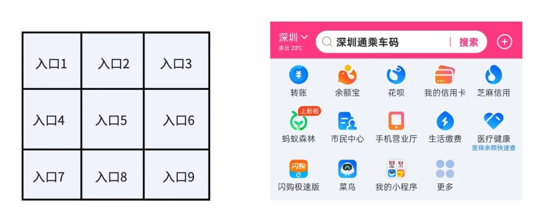 常用在多服务入口的产品,比如支付宝APP的功能菜单。