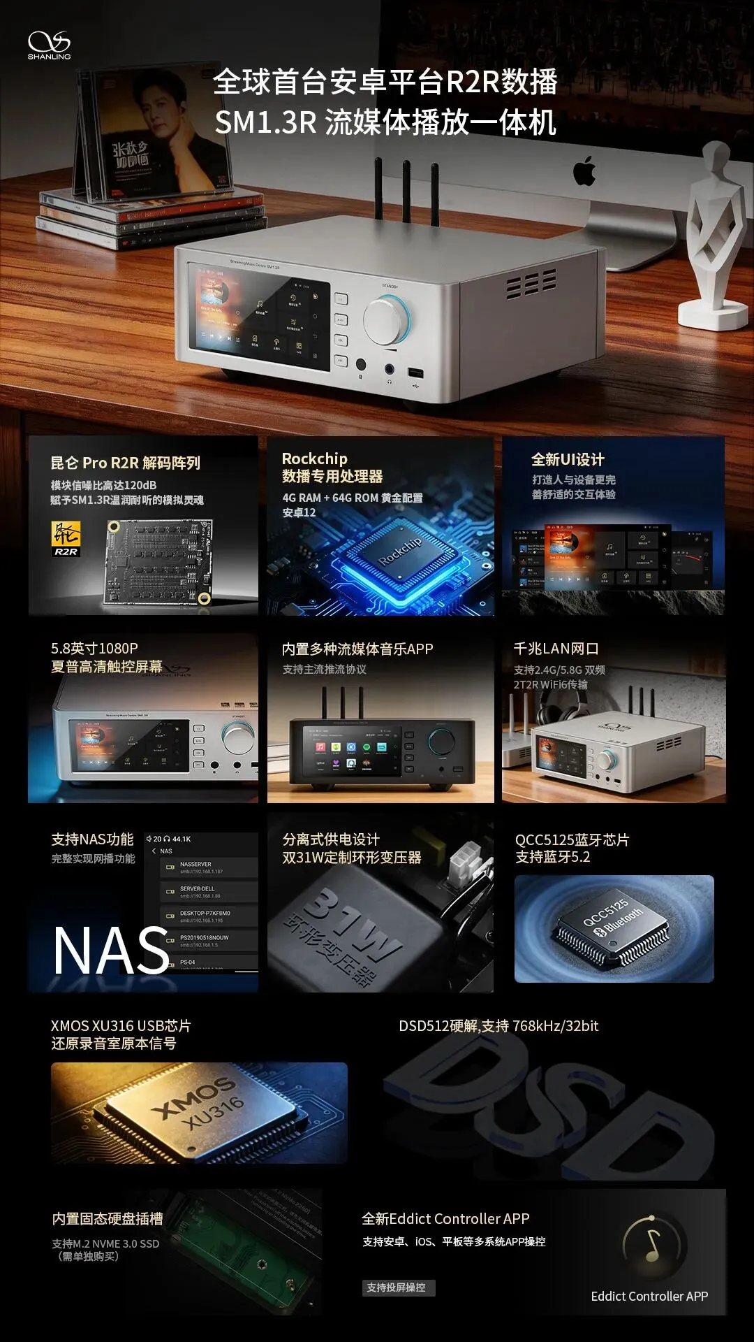 #全球首台安卓平台R2R数播 SM1.3R 流媒体播放一体机# 一图看懂🔸自研R2R模组第二代“昆仑Pro”R2R阵列 | 212颗0.01%高精度电阻 | 模块信噪比达120dB | 谐波失真仅为0.003%🔹分离式供电系统数字与模拟独立供电 | 双31W定制环牛 | 灌封工艺抗振降噪 | 声音纯净安定感增强🔸高精度数字音频引擎XMOS XU316 USB芯片 | ACCUSILICON高精度双钟振 | AGLO安卓全局无损输出 | 支持DSD512硬解🔹旗舰级数播平台 安卓12深度定制系统 | 4G RAM+64G ROM配置 | 定制数播系统UI🔸全场景流媒体生态内置多款流媒体APP | 支持DLNA、AirPlay2等主流推流协议 | 支持Roon Ready、Qobuz Connect等私有推流协议 | 手机端与原机操控逻辑统一