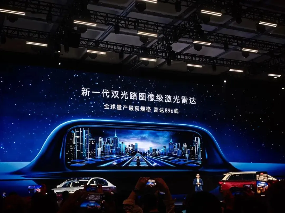 再看激光雷达,更新速度更明显:2022款2022年上市的时候,压根没装激光雷达,智驾也就停留在基础辅助的水平;2024款2024年上市,装了1颗126线激光雷达,就装在车头,能测150米左右,算是解决了远距离感知的问题;2026款2025年9月上市,装了1颗192线主激光雷达+1颗后向固态激光雷达,车头车尾各布局1颗,10%反射率下探测距离可达250米,感知范围和精度又上了一个台阶;到了3月份刚出的2026款焕新版,升级为1颗896线双光路图像级前向激光雷达+1颗后向固态激光雷达,其中896线雷达稳定感知识别距离120米,10%反射率下极限探测距离约160米,不管是成像分辨率、识别小目标的能力,还是在复杂环境下的适应力,都比192线的强太多,同时焕新版还搭载了华为最新的ADS 4.1智驾系统。