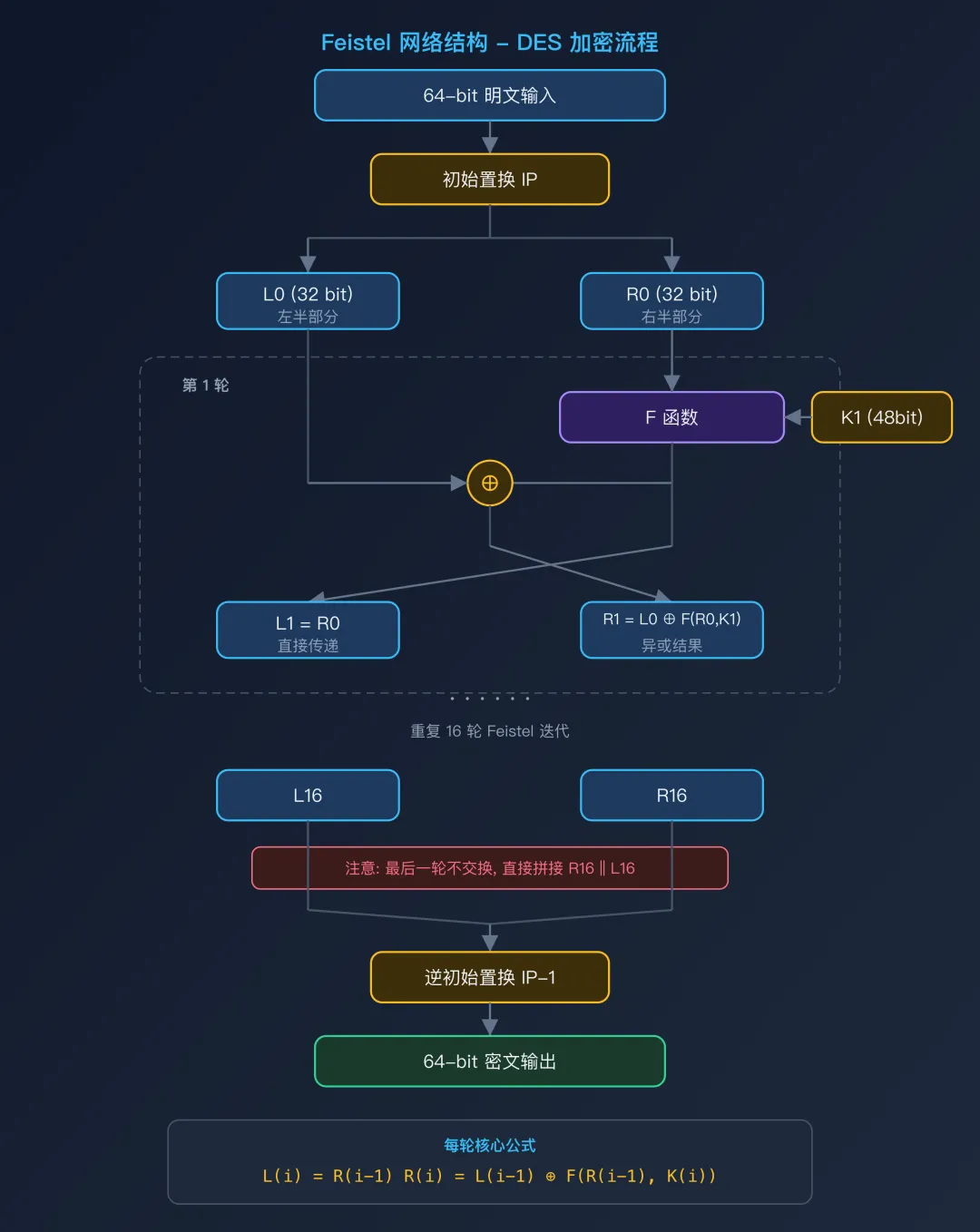 - 16 轮迭代:每轮使用对应子密钥 Ki,执行 Feistel 运算