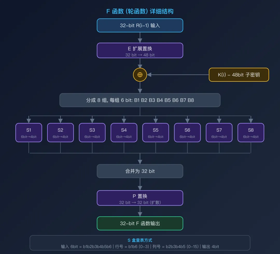 F 函数是 DES 的核心,也是算法安全性的关键所在。它将 32 bit 的 R(i-1) 和 48 bit 的子密钥 K(i) 作为输入,产生 32 bit 输出。F 函数包含四个步骤:E 扩展置换、与子密钥异或、S 盒代换、P 置换。