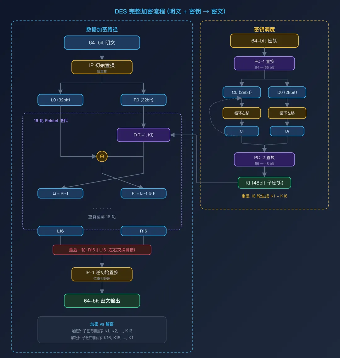 加密 vs 解密:解密过程与加密完全相同,唯一区别是子密钥使用顺序相反。加密使用 K1→K16,解密使用 K16→K1。这是 Feistel 结构的天然优势——加解密共用同一套硬件/软件实现。