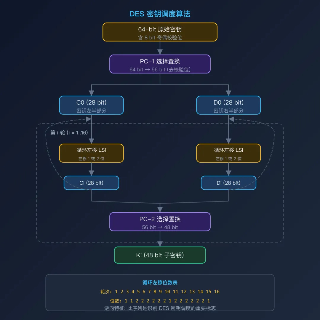 逆向要点:这个左移位数序列 1,1,2,2,2,2,2,2,1,2,2,2,2,2,2,1 也是识别 DES 的重要特征。如果在反汇编代码中看到这个数组(通常以 int shifts[16] 或 uint8_t shifts[] 形式存在),可以高度怀疑是 DES 密钥调度。