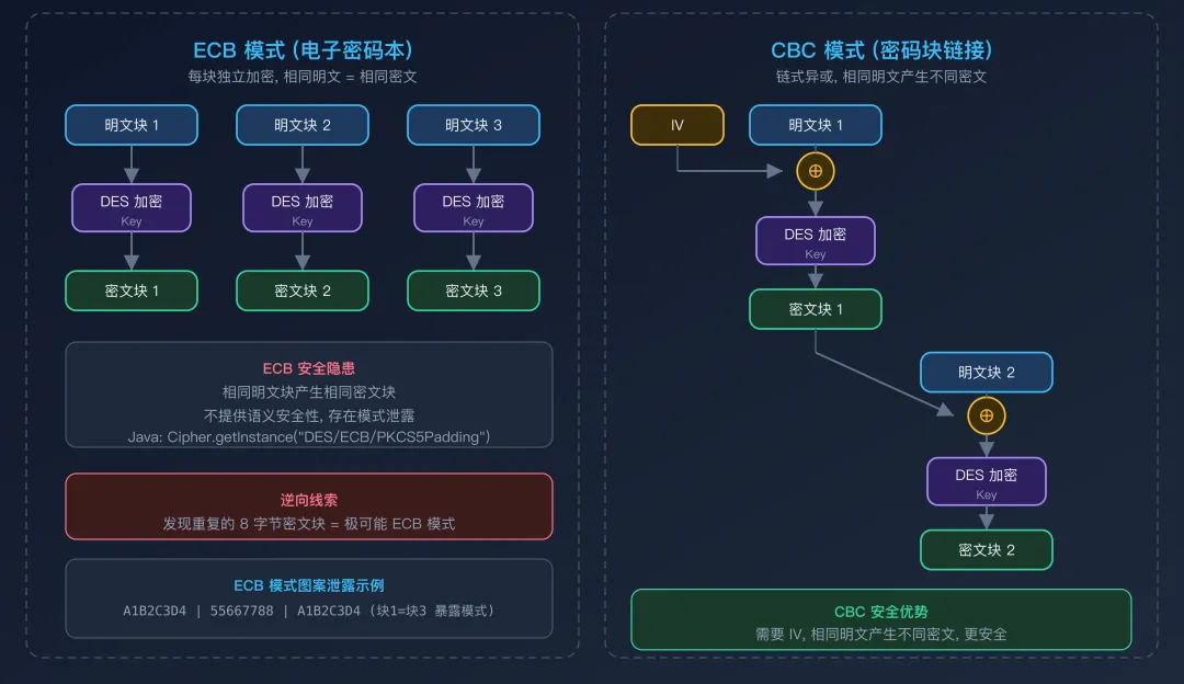 在安卓逆向中,不仅需要识别 DES 算法本身,还需要准确判断其工作模式(Mode of Operation)。不同模式对还原结果有直接影响——即使算法和密钥完全正确,模式判断错误也会导致解密失败。