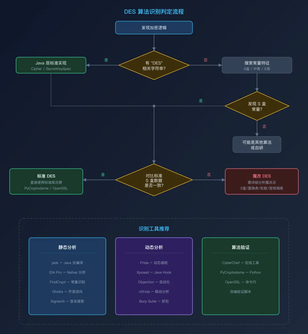 DES 识别判定流程识别三板斧:搜字符串 → 找常量 → 动态 Hook。其中字符串 "DES" 和 S 盒常量 14, 4, 13, 1... 是最可靠的识别特征。