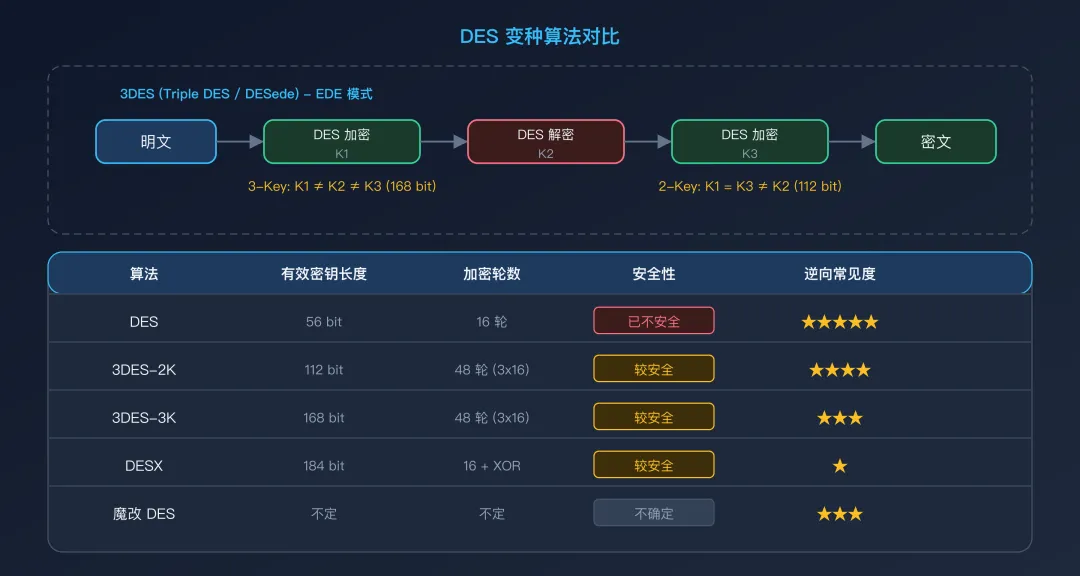 DESX 在逆向中很少见,但理解其原理有助于识别类似的"XOR 包裹"设计模式——很多自研加密方案都采用"先 XOR 再加密再 XOR"的结构。