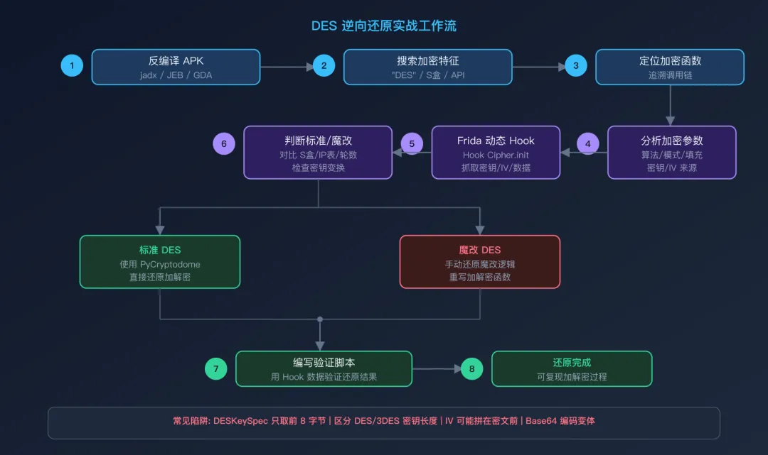 从安卓逆向的角度来看,DES 算法的识别和还原遵循以下核心思路: