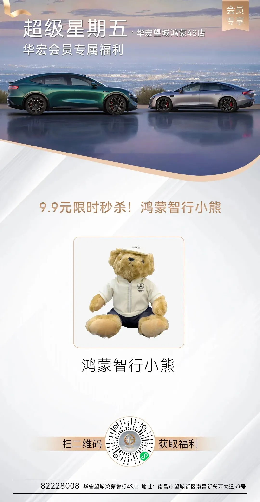 亲爱的华宏会员们,每周五的惊喜福利准时送达!这一次,鸿蒙智行用户中心为大家带来超萌的鸿蒙智行小熊限时秒杀抢购活动,还有鸿蒙智行车型的魅力展示,快来一起看看吧~