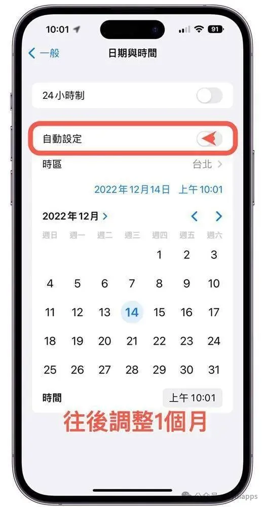 步骤 2. 直接将日期与时间「自动设置」关闭,直接将日期调整到一个月后,举个栗子是11月15日,往后调整一个月就是12月15日,设置完成后点选左上角「通用」完成设置。