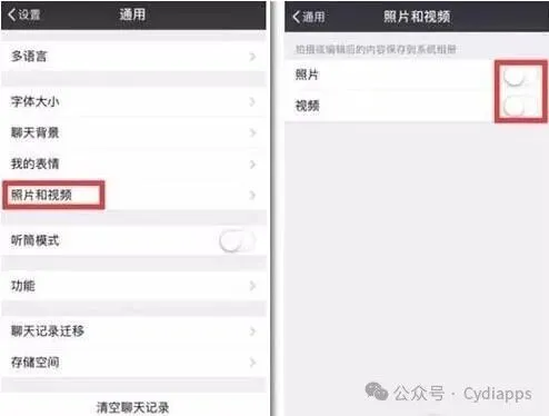 打开微信,“我”-“设置”-“通用”-“照片和视频”,对于里面的“照片”和“视频”选项关闭就可以了。确实太占内存了。