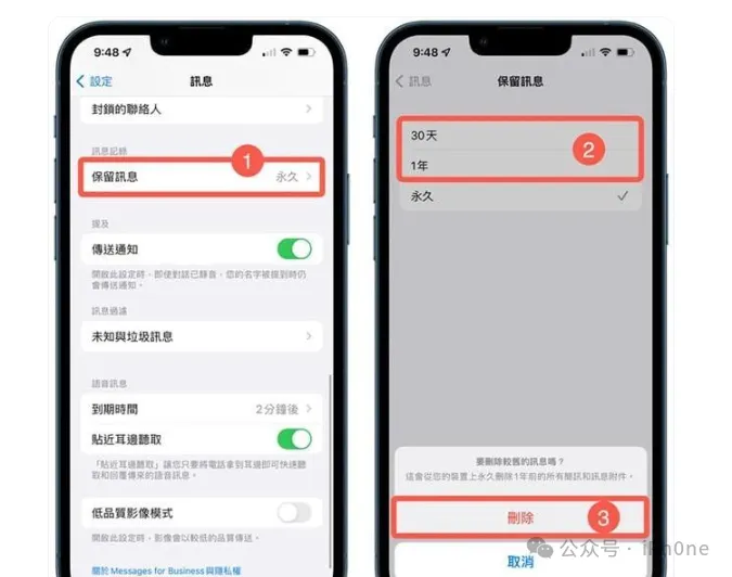 要是习惯使用 iOS 内建“信息 App”聊天,像是传送照片、影片、传文件档案,这些信息大型附件纪录都会一直被暂存在设备内,相对也会造成iPhone系统资料佔用过大。可以透过 iOS“设定”>“信息”>“保留信息”内,可以改为1年、30天,让iPhone自动定时删除简讯和信息附件。方法3. 删除回收站内的照片