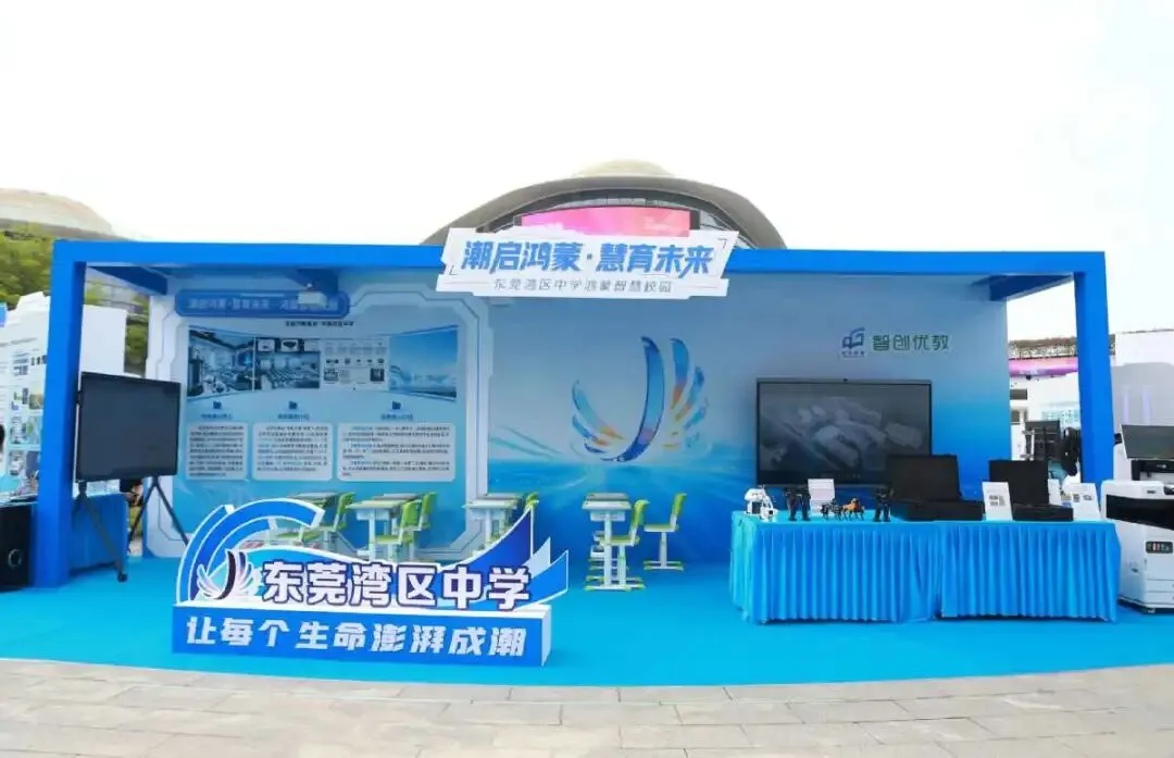 展区内,东莞湾区中学的鸿蒙AI智慧教室格外显眼。作为东莞市首批鸿蒙智慧校园试点校,湾区中学集中展示了鸿蒙编程、智能硬件开发等前沿课程以及小型人形机器人、开源鸿蒙仿生机器、鸿蒙实训套件等科创教具。