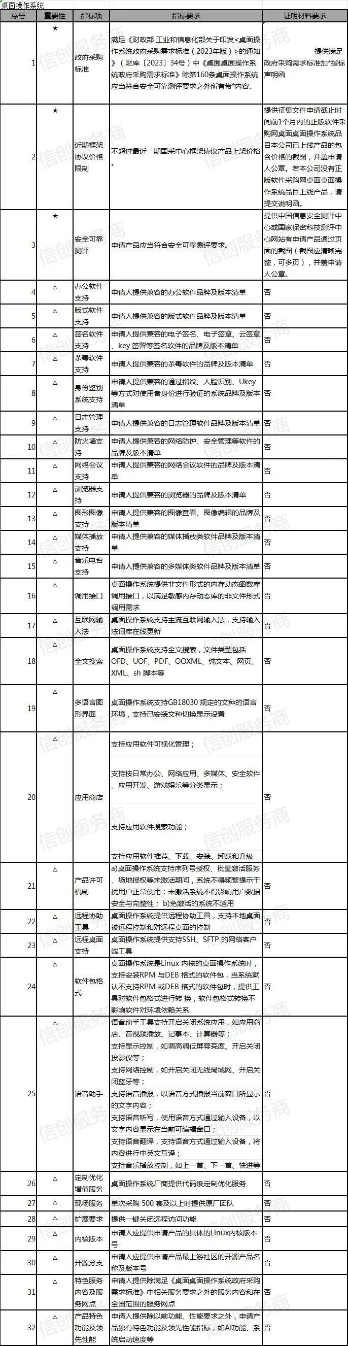 桌面系统:满足《财政部 工业和信息化部关于印发<操作系统政府采购需求标准(2023 年版)>的通知》(财库〔2023〕34 号)中《桌面操作系统政府采购需求标准》除第 160 条操作系统应当符合安全可靠测评要求之外所有带*内容。