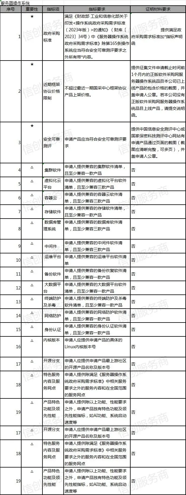 服务器系统:满足《财政部 工业和信息化部关于印发<操作系统政府采购需求标准(2023年版)>的通知》(财库〔2023〕34号)中《服务器操作系统政府采购需求标准》除第165条操作系统应当符合安全可靠测评要求之外所有带*内容。