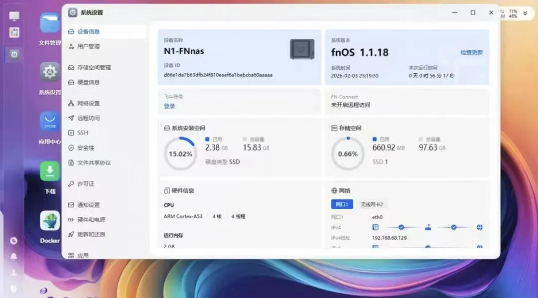 前几年斐讯N1最便宜的时候只要40-60元,而今年由于可以刷飞牛OS系统了,导致可玩性大幅提升,二手价值也水涨船高。由于它是低功耗CPU,平均耗电量就2W,一旦扩容存储或外挂移动硬盘后,就成为了很多人眼中的“NAS圣体”。如果自己不会刷飞牛系统,还可以在闲鱼买刷好的成品机,较新的固件版本应该是飞牛1.1.24。再来看目前二手价格,已刷好飞牛系统的斐讯N1最低80元自取或85元包邮,而扩容128G存储的N1最低130元,算是目前最便宜的ARM架构飞牛入门设备了。