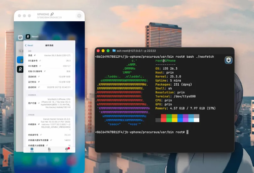- 出厂自带越狱环境,告别折腾:我以前给实体机越狱,找漏洞、防重启、防变砖简直是噩梦。这项目绝了,拉起的 Jailbreak 版本首次启动就自带 Sileo 和 TrollStore(巨魔)。对于需要搞逆向分析、抓包或者装特殊插件的后端兄弟来说,简直是开箱即用的神仙体验。