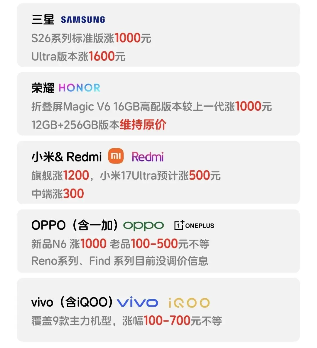 OPPO、vivo率先官宣涨价,中低端机型普遍涨200-500元,荣耀Magic V6顶配版直接提价1000元,小米智能手机业务毛利率同比下滑3.7个百分点,千元机时代彻底终结。