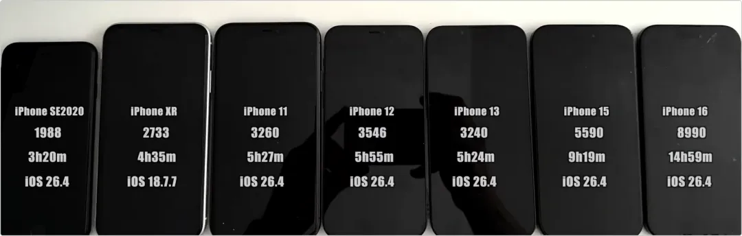 在本次测试中,6 款 iPhone 升级到 iOS 26.4,而 iPhone XR 升级到 iOS 18.7.7 作为对照升级系统后,清空后台并静置24小时,使系统完成运算。测试前均充满电、关闭自动亮度并统一25%亮度、安装相同App、设定相同音量