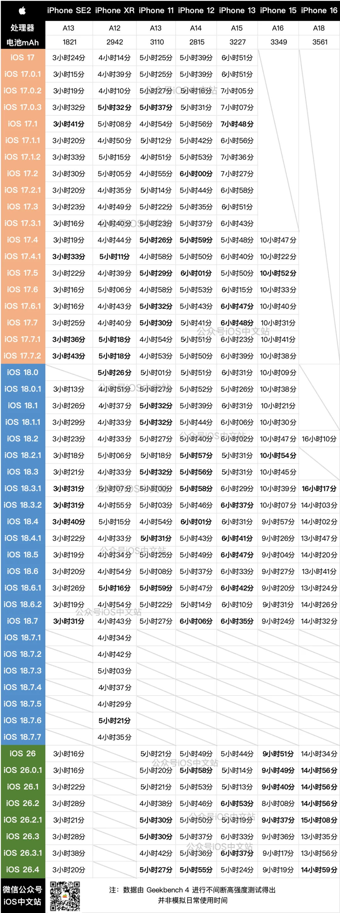 上方是iOS17、 iOS18所有版本、到目前 iOS26.4 的续航实测时间,大家自行对比。注意:要考虑电池健康度逐渐下降的问题,所以对比相近的版本比较合理