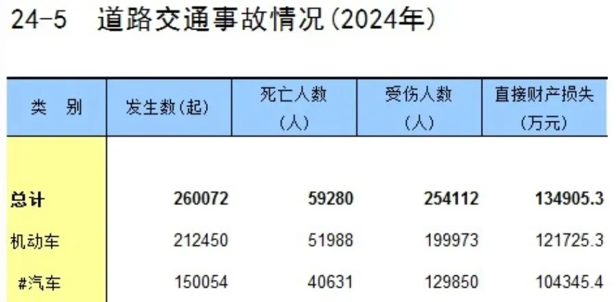 其实人类开车并不安全,根据《中国统计年鉴(2025)》发布的数据,我国2024年共发生汽车交通事故超过15万例(平均每天超过410例),造成死亡4万多人(平均每天超过110人)、受伤接近13万人(平均每天超过350人)。这些事故绝大多数是人类开车造成的。
