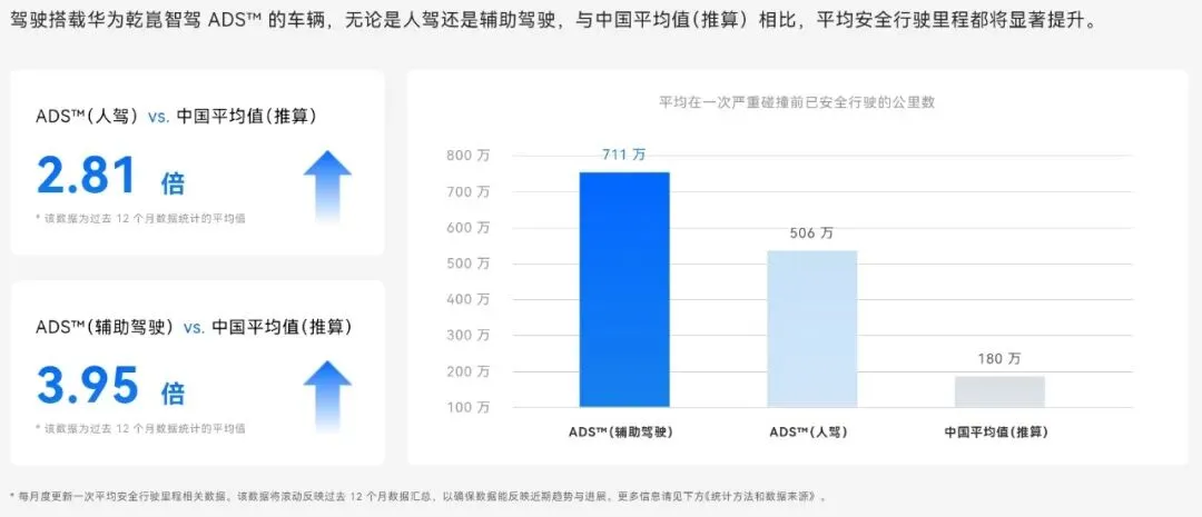 中国汽车平均每行驶180万公里就发生一次严重碰撞,而人类驾驶搭载华为智驾的汽车平均每506万公里发生一次严重碰撞。