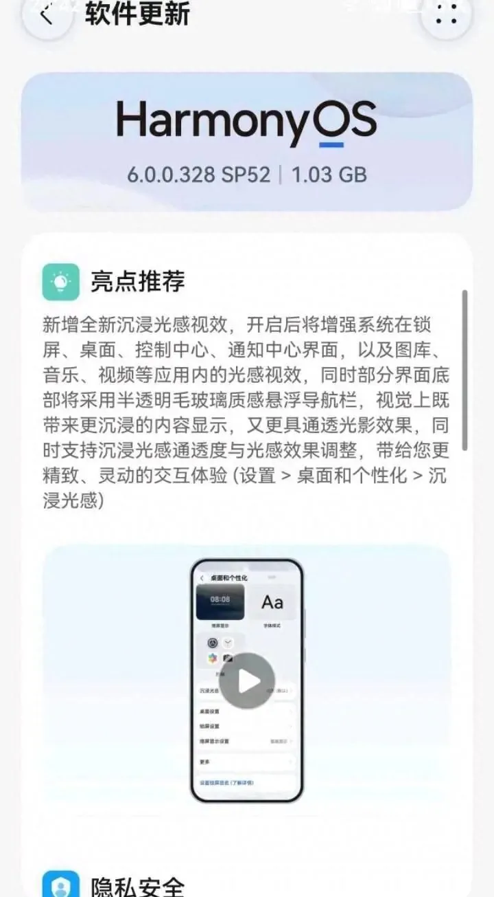 2026年3月27日,鸿蒙OS正式推送了6.0.0.328 SP52版本的更新,这次更新是针对多款主流机型进行的。安装包大概有1.04GB左右。这次升级主要在三个方面做了优化:系统性能提升、视觉体验升级,还有隐私安全方面的加强。