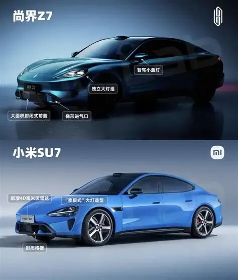 当年小米手机崛起时,华为推出荣耀品牌,从产品策略到宣传文案,全程贴着小米打。荣耀用“麒麟芯片+更便宜的价格”,硬生生从小米嘴里抢走了线上市场。鸿蒙智行推出尚界品牌,首款车型Z7直接对标小米SU7,价格带22.98万起,比SU7的21.99万只贵不到一万。更绝的是,尚界Z7的外观设计——低风阻轿跑、贯穿式尾灯、类似保时捷的大灯造型——和SU7放在一起,乍一看还真像“孪生兄弟”。有媒体直接问:“尚界Z7,能否狙杀新一代小米SU7?”因为荣耀当年的成功,靠的是“麒麟芯片+更便宜的价格”。但尚界Z7用的是华为的技术,价格却比小米贵。消费者为什么要为“更贵的技术”买单?更何况,小米SU7已经是成功的车型,甚至有了“溢价能力”。这和小米手机当年的处境完全不同。04. 谁更“不要脸”?鸿蒙智行的骚操作不止文案