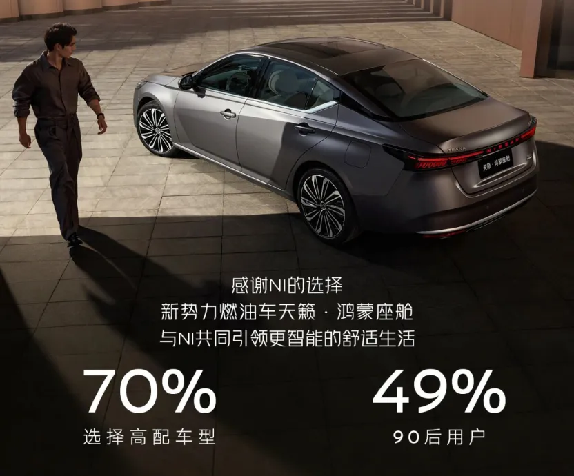 而天籁·鸿蒙座舱走出了一条完全相反的路径,也用数据印证了其年轻化转型的真正含金量。从车型选择来看,用户更倾向于15-16万的高配车型,旗舰版+智能超舒适版的销量占比高达70%,高配版本成为绝对主销。这意味着,年轻用户不是冲着“低价合资车”的标签选择天籁,而是主动为更高配置、更高价值的产品体验买单。