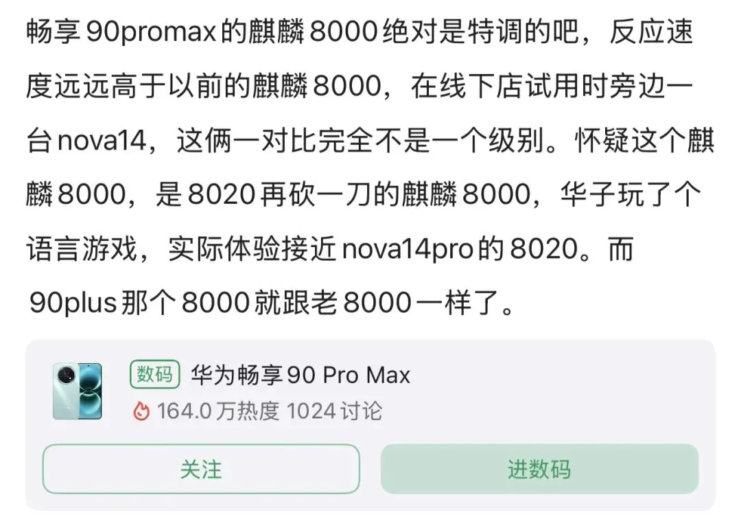最重点,华为这是趁别人病要别人命,本来他们就靠千元手机,结果刚好内存暴涨的情况下,华为发布了超高性价比的产品,最让他们难受的是,华为接下来还可能会对这些产品调价,例如再降200元,而且便宜点的华为畅享90流畅度也相当不错,不会因为没有1080P屏幕而导致流畅度很差,要知道入门的才1299元,国补后1100元左右,价格差距非常明显,但是流畅度一点不输高端旗舰,难怪博主会各种惊讶或者惊叹华为的优化能力