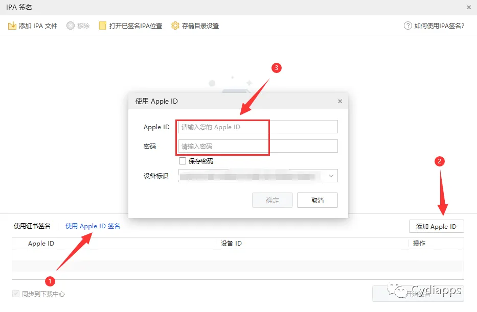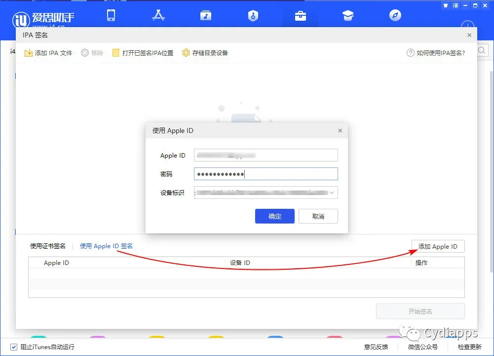 点击使用Apple ID签名,然后输入你的ID账号和密码进行签名,设备标识指的是你要给他签名的设备的标识,在打开爱思助手后,插入数据线连接上设备会自动识别。输完ID和密码点击确定。