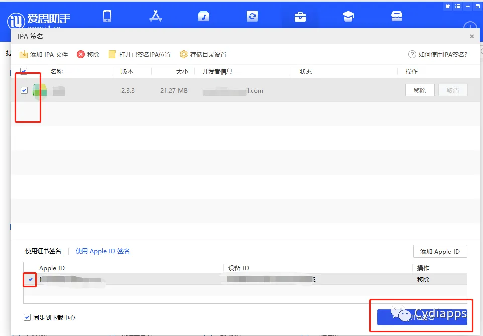 添加好ipa后,点击AppleID前和软件前的√勾选,点击开始签名,如果是显示签名成功,代表签名好了,这个时候点击 打开已签名的ipa位置,