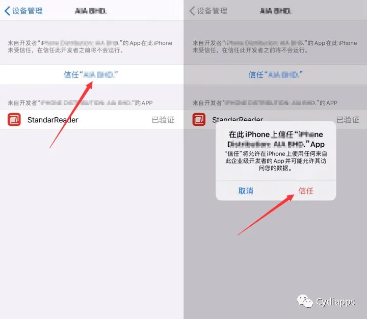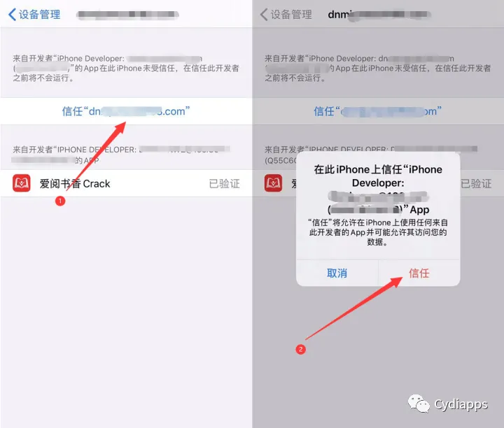 14、返回手机桌面,可以看到已经安装好的爱阅书香了。15、这时打开它会跳出一个“不受信任的开发者”的提示。自签版和企业版都会出现这个提示,我们需要在设置里给它添加信任,就可以打开了。16、打开手机设置--通用--设备信任--开发者APP--信任(iOS16+还要打开iOS开发者模式)