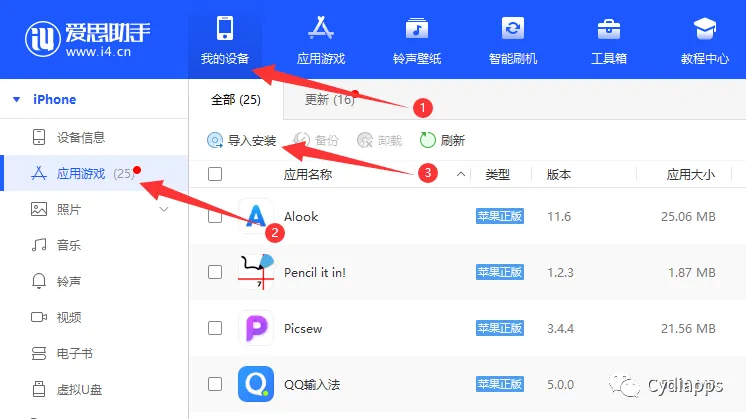 2、点击「我的设备」,再选择「应用游戏」-- 「导入安装」。