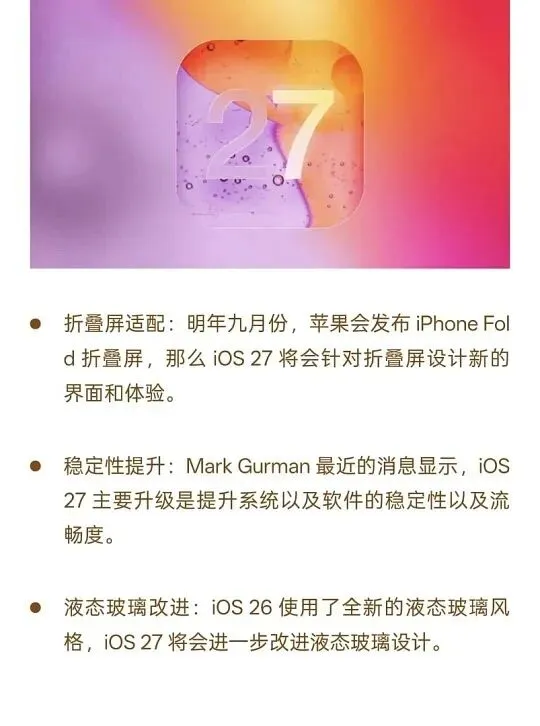 行业趋势上,iOS 27更像一场“雪豹式”蜕变,与其疯狂堆新功能,不如聚焦底层稳定性、性能、续航和流畅度,兑现苹果对老用户的承诺。今年用户更看重系统实际流畅体验,花哨视觉和AI加持都是锦上添花。常规用户没必要等折叠屏,常规iPhone买新不买旧,系统体验拉满,信号、续航明显提升,够用就行。折叠屏更适合商务和尝鲜群体,适配周期仍需时间消化。