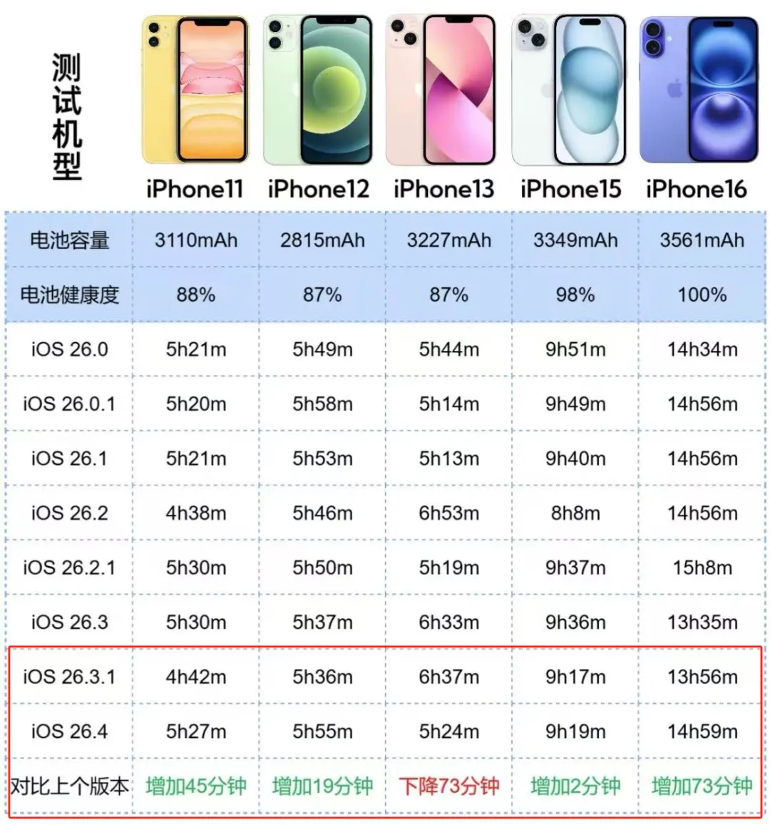 外网博主 iAppleBytes 在同样的条件下,从iPhone 11到16进行了实测,从满电到“榨干”关机进行了对比。