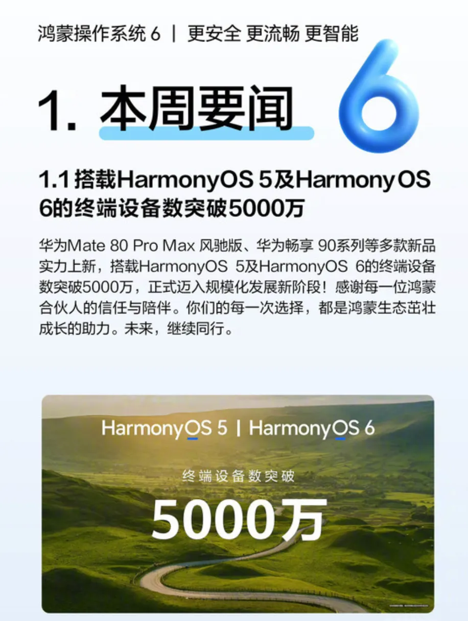 根据官方发布的信息,华为已经正式确认了搭载HarmonyOS 5及6的终端设备数在本周突破了5000万台。