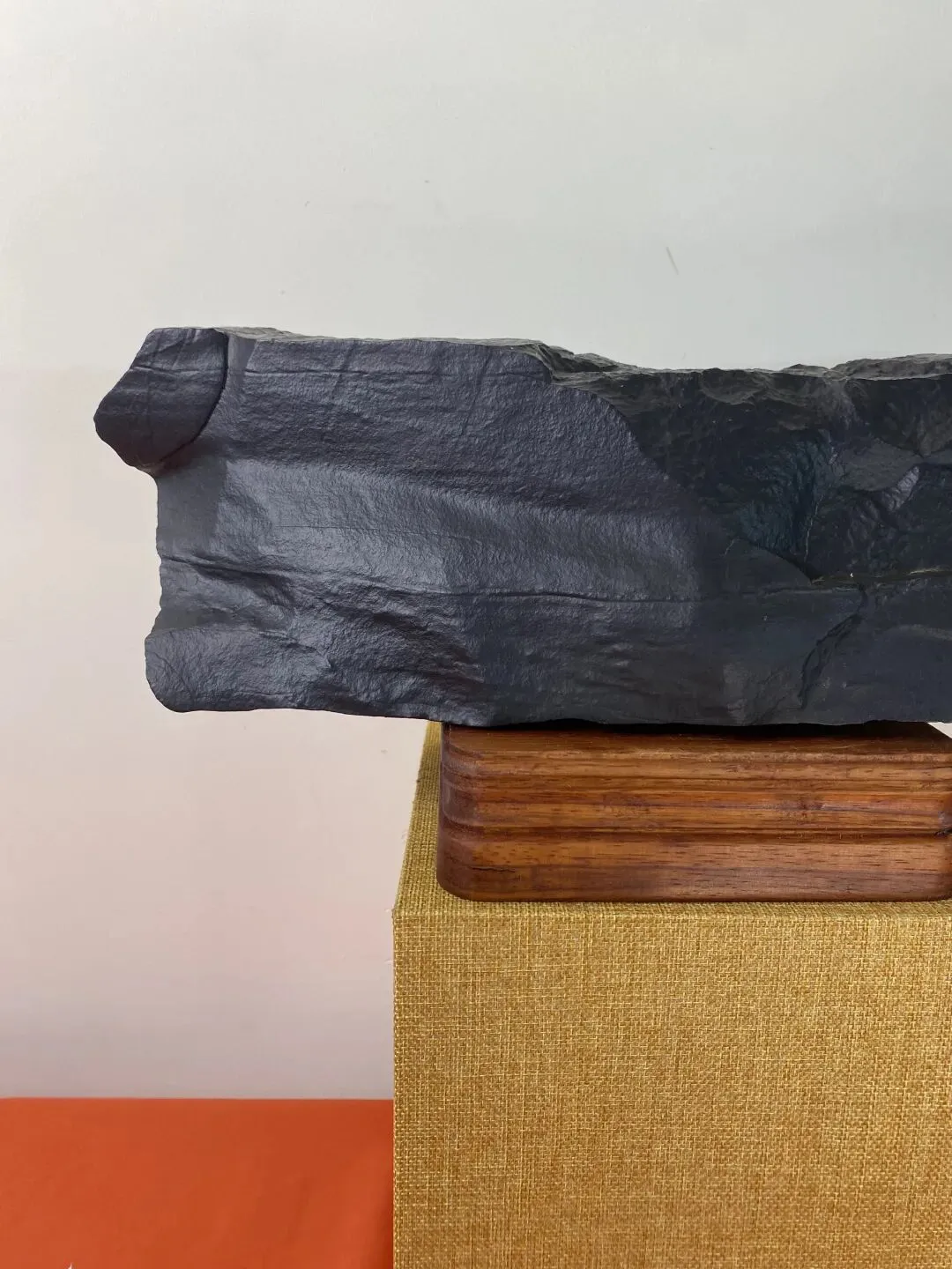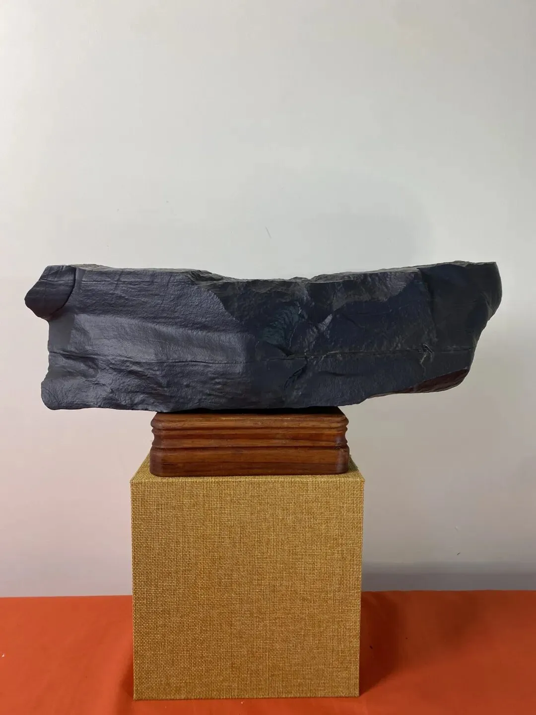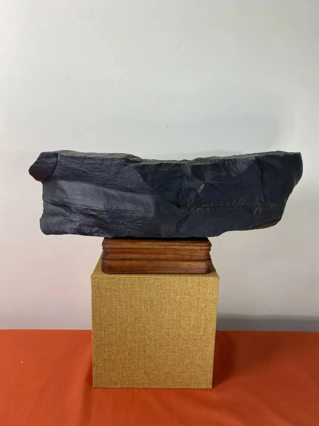 皮色与质地更显珍贵:深墨蓝的黑碧玉质地致密细腻,表面经亿万年风蚀形成褶皱状哑光包浆,无一丝人工痕迹,如红山文化玉器般古朴肃穆。这种纯粹的单色石,摒弃了繁杂纹饰,以极简之美直击人心,契合当代东方禅意审美,既可置于文人长案,亦可作为空间艺术装置,拓展了赏石的边界。