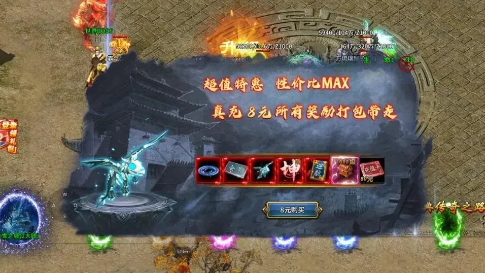 - 如需更强战力,可继续追加**328米**直充,获得完美级技能+九尾妖狐宠物(超级幸运属性);**648米**直充更可解锁史诗级神级技能、充值卡及千手如来时装。