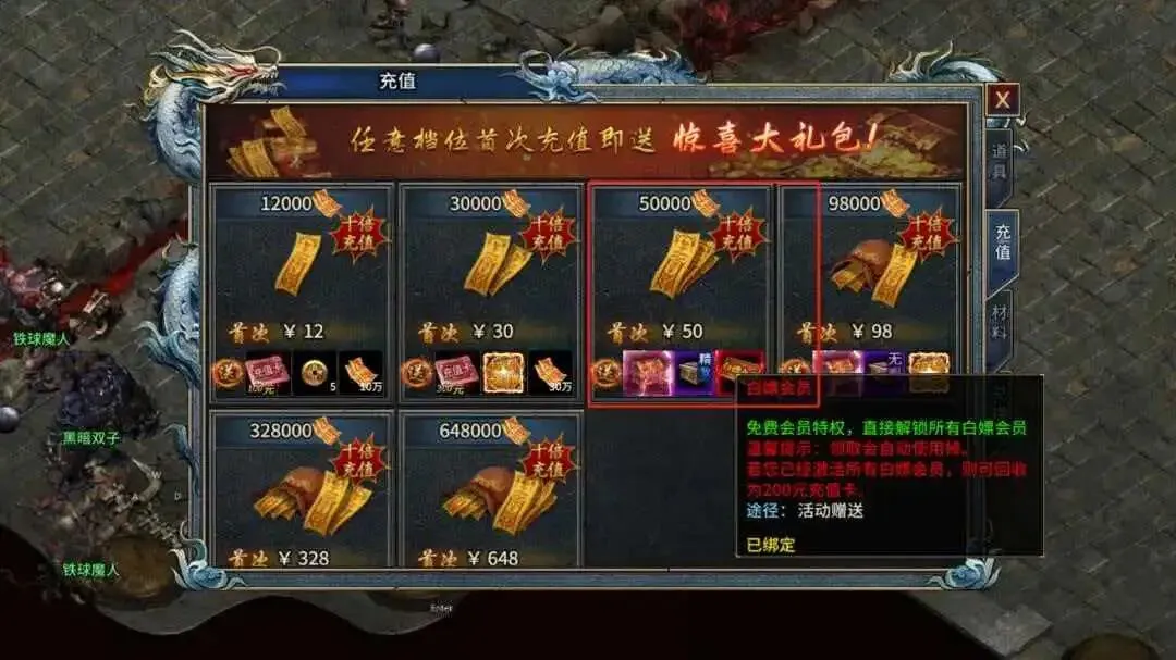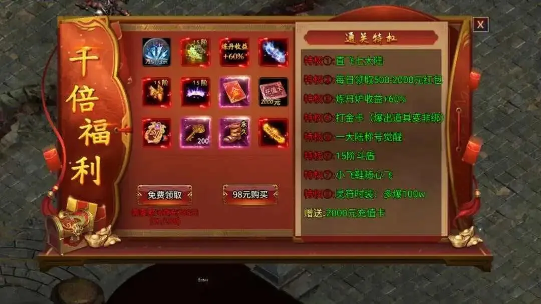 - **50米直冲**:解锁**两大会员特权**,并赠送500-2000红卡宝箱,同时获得仙阵、白银会员、宠物、八卦装备、巡航、千级礼包等超值道具。
