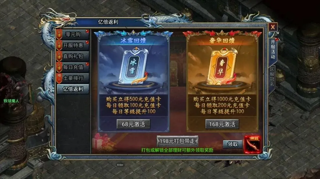 在“中氪”基础上,额外购买**198米亿倍返利**,直接起飞!累计充值288米还可**免费领取通关特权**,搭配开服活动的68+168礼包,每日直升两百级,充值卡拿到手软。